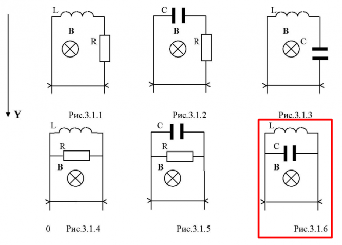 Задача 3.1. По двум гладким медным шинам, установленным вертикально в однородном магнитном поле B скользит под действием силы тяжести медная перемычка массы m, которая замыкает электрическую цепь, приведенную на рисунке. Расстояние между шинами l. Сопротивления шин, перемычки и скользящих контактов, а также самоиндукция контура пренебрежимо малы. Найти закон движения перемычки Y(t) при условии, что начальная скорость, ток через индуктивность и заряд на конденсаторе равны 0, Y(0)=Y0. L C L B B B R R C Y Рис.3.1.1 Рис.3.1.2 Рис.3.1.3 L C L R R C B B B 0 Рис.3.1.4 Рис.3.1.5 Рис.3.1.6 Таблица 3.1.1 Номера вариантов и значения параметров L , R , C для соответствующего номера рисунка.   Варианты 1-8.