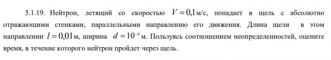 5.1.19. Нейтрон, летящий со скоростью V 0,1 м/с, попадает в щель с абсолютно отражающими стенками, параллельными направлению его движения. Длина щели в этом направлении l 0,01 м, ширина 6 10 d м. Пользуясь соотношением неопределенностей, оцените время, в течение которого нейтрон пройдет через щель. 5.2.19. Частица с энергией E налетает на прямоугольный потенциальный порог высотой U0 ( E U0 ). Найдите приближенное выражение для коэффициента отражения R для случая 1 0 0 U E U . .