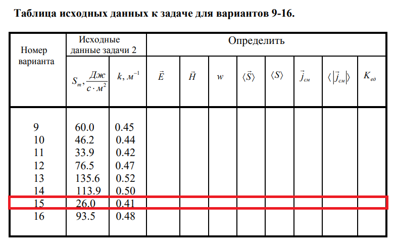 9) записать волновое уравнение для магнитной и электрической компонент рассматриваемой электромагнитной волны и изобразить схематично мгновенную фотографию этой волны. Таблица исходных данных к задаче для вариантов 9-16. .