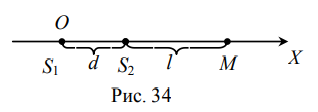 В среде на расстоянии d друг от друга находятся одинаковые излучатели плоских продольных, акустических, монохроматических волн (S1 и S2, рис.34). Оба излучателя колеблются по закону =Acos(t), где  - смещение излучателя из положения равновесия при колебаниях, A - амплитуда,  - круговая частота при колебаниях излучателя