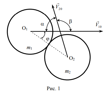 Две гладкие частицы сферической формы с массами m1 и m2, движущиеся со скоростями V10 и V20 , сталкиваются под углом , как указано на рис.1. Расстояние до места встречи и скорости частиц соответствуют условиям соударения (отсутствию промаха).