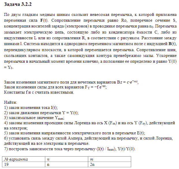 По двум гладким медным шинам скользит невесомая перемычка, к которой приложена переменная сила F(t). Сопротивление перемычки равно Ro, поперечное сечение S, концентрация носителей заряда (электронов) в проводнике перемычки равна n0. Перемычка замыкает электрическую цепь, состоящую либо из конденсатора ёмкости С, либо из индуктивности L или из сопротивления R, в соответствии с рисунком. Расстояние между шинами l. Система находится в однородном переменном магнитном поле с индукцией В(t), перпендикулярном плоскости, в которой перемещается перемычка. Сопротивление шин, скользящих контактов, а также самоиндукция контура пренебрежимо малы. Ускорение перемычки в начальный момент времени конечно, а положение ее определено и равно Y(0) = Y0.