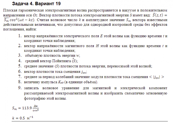 Плоская гармоническая электромагнитная волна распространяется в вакууме в положительном направлении оси Oz. Вектор плотности потока электромагнитной энергии S имеет вид: S(z, t) = Smcos2(wt-kz). Считая волновое число k и амплитудное значение Sm вектора известными действительными величинами, что допустимо для однородной изотропной среды без эффектов поглощения, найти...