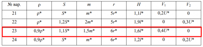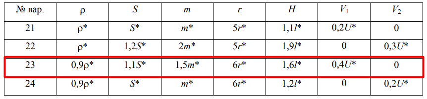 Пробирку, находящуюся в положении равновесия на глубине Н0, смещают на глубину H, а затем импульсом придают ей в начальный момент времени t=0 скорость V1 или V2 , в соответствии с заданием (см. таблицу № 14). В результате КС приходит в колебательное движение в вертикальном направлении. Коэффициент сопротивления при движении пробирки в жидкости равен r.