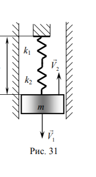 3-3.Каждая колебательная система (КС), представленная на рис. 28, 29, 30, 31, состоит из шайбы массой m и двух упругих пружин, имеющих жесткости k1 и k2 . Движение КС происходит в окружающей среде с малыми вязкими свойствами (малым коэффициентом сопротивления r). На рис. 28, 30 шайба колеблется под действием пружин, соединенных параллельно, а на рис. 29, 31 колебания происходят под действием пружин, соединенных последовательно. Массой пружин можно пренебречь. На рис. 28, 29 КС имеет горизонтальное расположение, а на рис. 30, 31 вертикальное расположение в поле силы тяжести. Длины 1-ой и 2-ой пружин в недеформированных состояниях равны l10 и l20. На рис.28, 30 L - длина каждой пружины в деформированном состоянии при t=0. На рис.29, 31 L - общая длина двух пружин в деформированном состоянии при t=0. Возможные векторы начальной скорости шайбы равны V1 , V2 . Шайбу, находящуюся в положении равновесия, смещают до расстояния L, а затем импульсом придают ей в начальный момент времени t=0 скорость V1 или V2 , в соответствии с заданием (см. таблицы № 10 - 13). В результате КС приходит в колебательное движение.