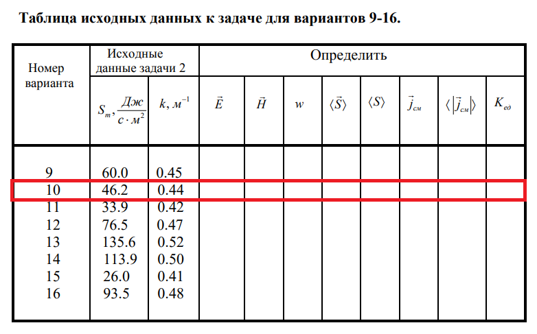 9) записать волновое уравнение для магнитной и электрической компонент рассматриваемой электромагнитной волны и изобразить схематично мгновенную фотографию этой волны. Таблица исходных данных к задаче для вариантов 9-16. .
