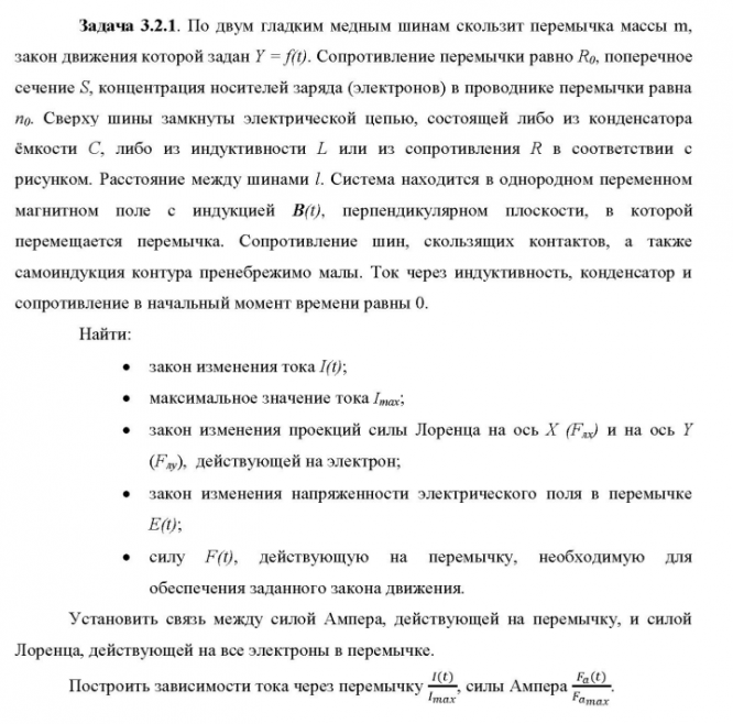 Задача 3.2.1 По двум гладким медным шинам скользит перемычка массы m, закон движения которой задан Y = f(t). Сопротивление перемычки равно Ro, поперечное сечение S, концентрация носителей заряда (электронов) в проводнике перемычки равна n0. Сверху шины замкнуты электрической цепью, состоящей либо из конденсатора ёмкости С, либо из индуктивности L или из сопротивления R в соответствии с рисунком. Расстояние между шинами l. Система находится в однородном переменном магнитном поле с индукцией B(t), перпендикулярном плоскости, в которой перемещается перемычка. Сопротивление шин, скользящих контактов, а также самоиндукция контура пренебрежимо малы. Ток через индуктивность, конденсатор и сопротивление в начальный момент времени равен 0.