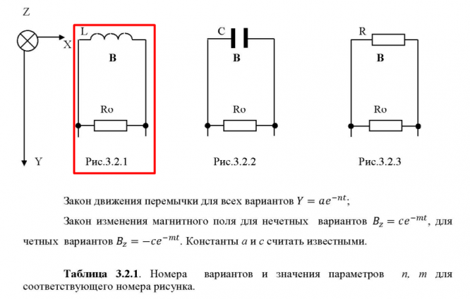 Найти: - закон изменения тока I (t); - максимальное значение тока I max; - закон изменения проекций силы Лоренца на ось X (Fлx) и на ось Y (Fлy), действующей на электрон ; - закон изменения напряженности электрического поля в перемычке E(t); - силу F(t), действующую на перемычку, необходимую для обеспечения заданного закона движения ; - установить связь между силой Ампера, действующей на перемычку, и силой Лоренца, действующей на все электроны в перемычке. Z L C R X B B B Ro Ro Ro Y Рис.3.2.1 Рис.3.2.2 Рис.3.2.3 Закон движения перемычки для всех вариантов Y = a exp(- nt); Закон изменения магнитного поля для нечетных вариантов ВZ = c exp(- mt), для четных вариантов ВZ = -c exp(- mt).