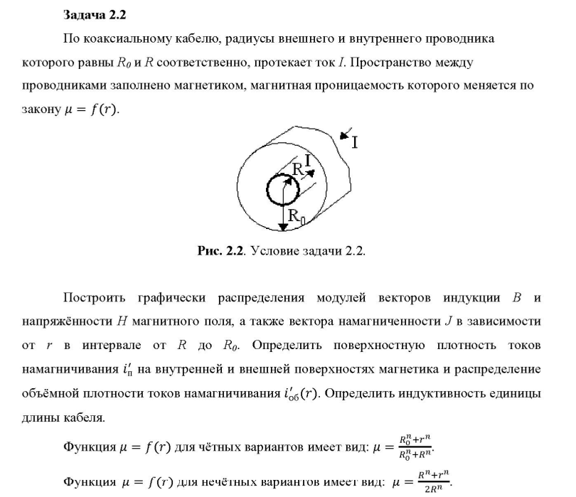 Значения параметров n и R0/R в зависимости от номера варианта  Задача 2.2. По коаксиальному кабелю, радиусы внешнего и внутреннего проводника которого равны R0 и R соответственно, протекает ток I. Пространство между проводниками заполнено магнетиком, магнитная проницаемость которого меняется по закону =f(r). Построить графически распределения модулей векторов индукции B и напряжённости H магнитного поля, а также вектора намагниченности J в зависимости от r в интервале от R до R0. Определить поверхностную плотность токов намагничивания i\'п на внутренней и внешней поверхностях магнетика и распределение объёмной плотности токов намагничивания i\'об(r). Определить индуктивность единицы длины кабеля.