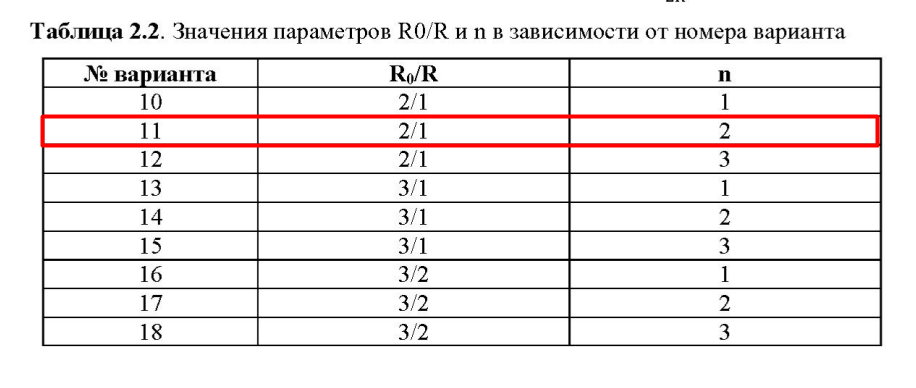 Функция =f(r) для чётных вариантов имеет вид: =(R0 n +rn )/(R0 n +Rn ). Функция =f(r) для нечётных вариантов имеет вид: =(Rn +rn )/2Rn . Таблица 2.2. Значения параметров R0/R и n в зависимости от номера варианта .