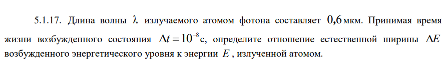 5.1.17. Длина волны  излучаемого атомом фотона составляет 0,6 мкм. Принимая время жизни возбужденного состояния 8 10 t  с, определите отношение естественной ширины E возбужденного энергетического уровня к энергии E , излученной атомом.   5.2.17. Электрон с энергией E движется над прямоугольной потенциальной ямой шириной a и глубиной U0 . Найдите значения энергии E , при которых электрон будет беспрепятственно проходить над ямой. Убедитесь, что это будет происходить при условии, что ширина ямы a равна целому числу дебройлевских полуволн частицы внутри ямы. Вычислите минимальную энергию электрона Emin при U0 10 эВ и a  0,25 нм..
