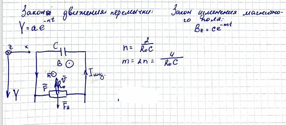 Условие:По двум гладким медным шинам скользит перемычка массы M, закон движения которой задан Y = f(t). Сопротивление перемычки равно , поперечное сечение S, концентрация носителей заряда (электронов) в проводнике перемычки равна . Сверху шины замкнуты электрической цепью, состоящей из конденсатора ёмкости С. Расстояние между шинами l. Система находится в однородном переменном магнитном поле с индукцией B(t), перпендикулярном плоскости, в которой перемещается перемычка. Сопротивление шин, скользящих контактов, а также самоиндукция контура пренебрежимо малы. Ток через конденсатор в начальный момент времени равен 0.