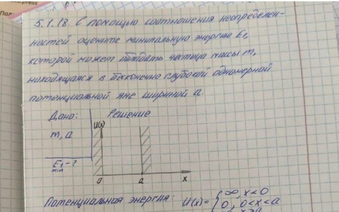 5.1.18. С помощью соотношения неопределенностей оцените минимальную энергию E1 , которой может обладать частица массы m , находящаяся в бесконечно глубокой одномерной потенциальной яме шириной а .