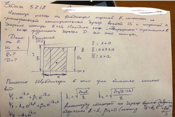 5.2.18. Частица массы m0 , обладающая энергией E , налетает на прямоугольный потенциальный барьер высотой U0 и шириной a . Энергия частицы E U0 . Найдите коэффициент “надбарьерного” отражения R и коэффициент прозрачности барьера D для этой частицы