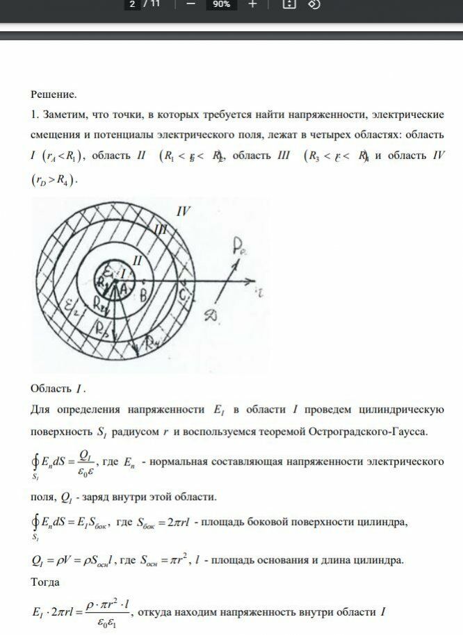 ТИПОВОЙ РАСЧЕТ Длинная коаксиальная цилиндрическая система образована цилиндрическим диэлектрическим стержнем. Радиус стержня R1, относительная диэлектрическая проницаемость ε1 , объемная плотность заряда ρ. Металлическая труба имеет внутренний радиус R2 и наружный радиус R3. На единице длины трубы находится заряд τ. Металлическая труба окружена цилиндрическим слоем диэлектрика радиусов R3 и R4 , относительная диэлектрическая проницаемость которого равна ε2. Необходимо: 1. Рассчитать напряженность электрического поля, электрическое смещение и электрический потенциал в точках А, В, С и D. Принять начало отсчета потенциала на оси симметрии системы. 2. Построить графики E (r), D (r) и φ (r). 3. Найти поверхностную плотность связанных зарядов на границах диэлектриков. 4. Рассчитать энергию электрического поля заданной системы, приходящуюся на единицу длины в цилиндре радиуса rD . 5. Определить поверхностную плотность свободных зарядов на внутренней и внешней поверхностях металлической трубы. 6. Рассчитать потенциальную энергию электрического диполя pe = 10-28 Кл∙м, находящегося в точке D и ориентированного под углом α к радиальному направлению. Определить момент сил, вращающих электрический диполь. Дано: 3 3 1 2 1 2 3 4 1 10 Кл м , 1,5, 1,5, 1 cм, 2 cм, 3 cм, 4 cм, R R R R 6 0,5 cм, 1,5 cм, 3,5 cм, 5 cм, 2 10 Кл м, .
