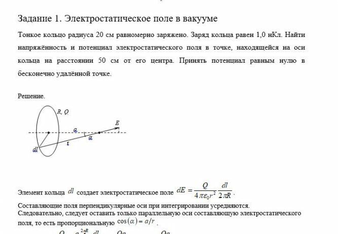 Тонкое кольцо радиуса 20 см равномерно заряжено. Заряд кольца равен 1,0 нКл. Найти напряжённость и потенциал электростатического поля в точке, находящейся на оси кольца на расстоянии 50 см от его центра. Принять потенциал равным нулю в бесконечно удалённой точке.