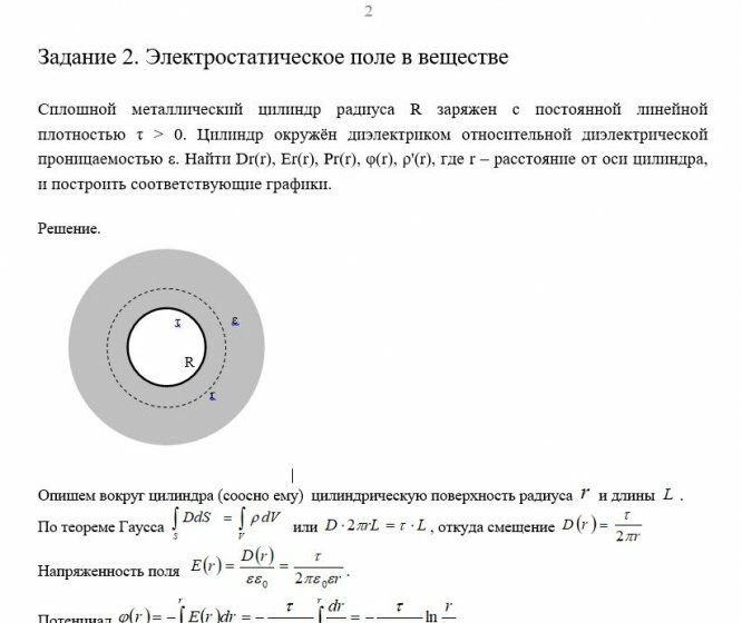 Сплошной металлический цилиндр радиуса R заряжен с постоянной линейной плотностью τ > 0. Цилиндр окружён диэлектриком относительной диэлектрической проницаемостью ε. Найти Dr(r), Er(r), Pr(r), φ(r), ρ'(r), где r – расстояние от оси цилиндра, и построить соответствующие графики