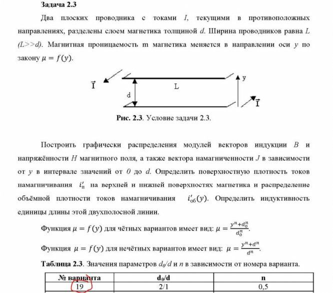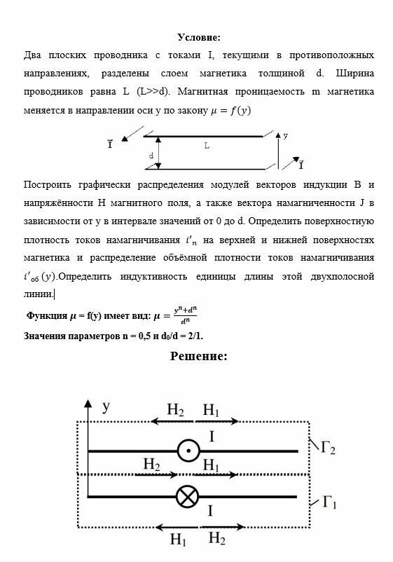 Построить графически распределения модулей векторов индукции B и напряжённости H магнитного поля, а также вектора намагниченности J в зависимости от у в интервале значений от 0 до d. Определить поверхностную плотность токов намагничивания на верхней и нижней поверхностях магнетика и распределение объёмной плотности токов намагничивания .Определить индуктивность единицы длины этой двухполосной линии.