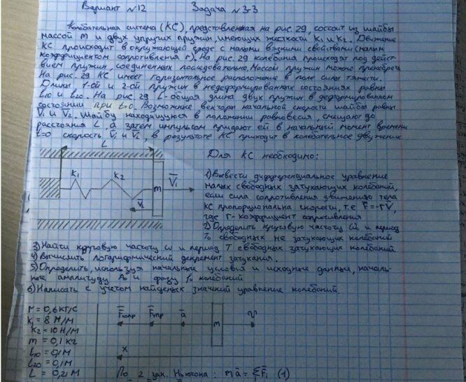 Каждая колебательная система (КС), представленная на рис. 28, 29, 30, 31, состоит из шайбы массой m и двух упругих пружин, имеющих жесткости k1 и k2 . Движение КС происходит в окружающей среде с малыми вязкими свойствами (малым коэффициентом сопротивления r). На рис. 28, 30 шайба колеблется под действием пружин, соединенных параллельно, а на рис. 29, 31 колебания происходят под действием пружин, соединенных последовательно. Массой пружин можно пренебречь. На рис. 28, 29 КС имеет горизонтальное расположение, а на рис. 30, 31 вертикальное расположение в поле силы тяжести. Длины 1-ой и 2-ой пружин в недеформированных состояниях равны l10 и l20. На рис.28, 30 L - длина каждой пружины в деформированном состоянии при t=0. На рис.29, 31 L - общая длина двух пружин в деформированном состоянии при t=0. Возможные векторы начальной скорости шайбы равны V1, V2. Шайбу, находящуюся в положении равновесия, смещают до расстояния L, а затем импульсом придают ей в начальный момент времени t=0 скорость V1 или V2 , в соответствии с заданием (см. таблицы №10 - 13). В результате КС приходит в колебательное движение
