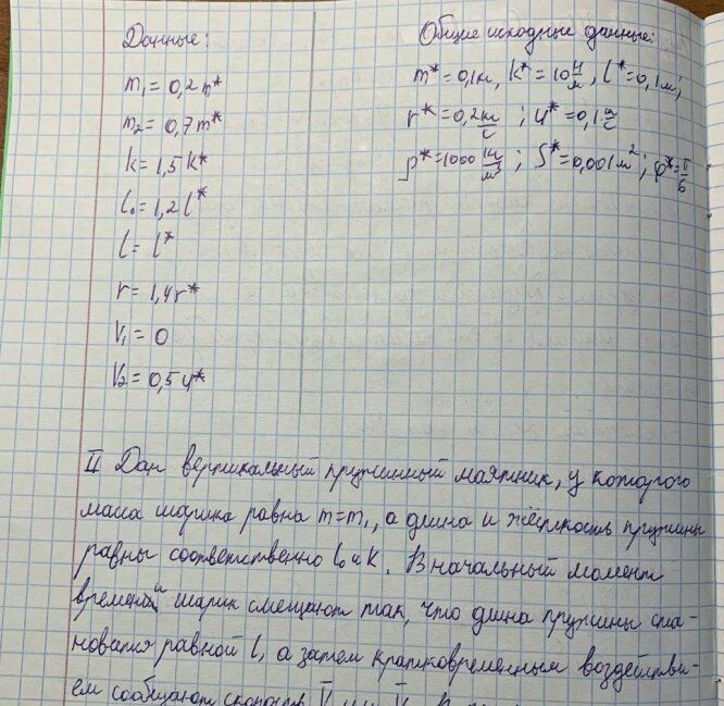 Дополнительно (в соответствии с общими условиями задачи 3) рассчитать все требуемые величины и вывести уравнение затухающих колебаний вертикального пружинного маятника (см. рис. 27), у которого масса шарика равна m = m1, а длина и жёсткость пружины равны соответственно l0 и k (см. табл.9). В начальный момент времени шарик смещают так, что длина пружины становится равной l, а затем кратковременным воздействием сообщают скорость v1 или v2 . В результате система приходит в колебательное движение в вертикальном направлении. Трением шарика о боковую поверхность пренебречь