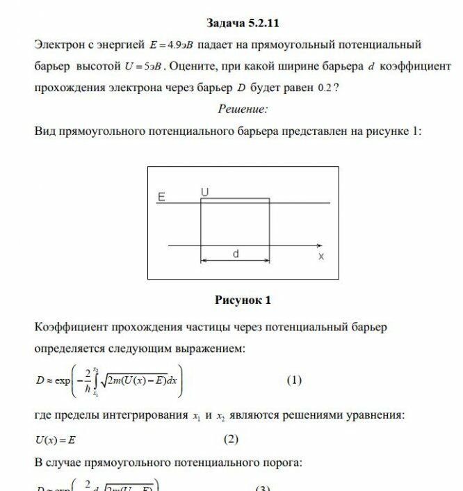 Электрон с энергией падает на прямоугольный потенциальный барьер высотой . Оцените, при какой ширине барьера коэффициент прохождения электрона через барьер будет равен ?