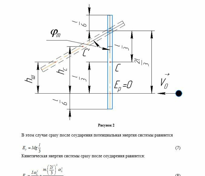 Сразу после удара стержень вращается с угловой скоростью 0, а шарик приобретает скорость и продолжает двигаться в плоскости рисунка. Другие обозначения: