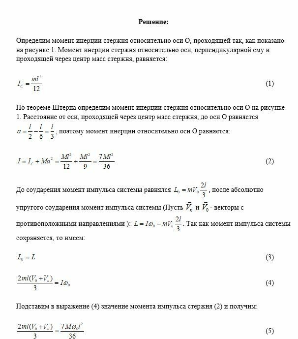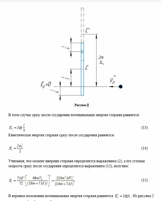 Сразу после удара стержень вращается с угловой скоростью 0, а шарик приобретает скорость и продолжает двигаться в плоскости рисунка. Другие обозначения: