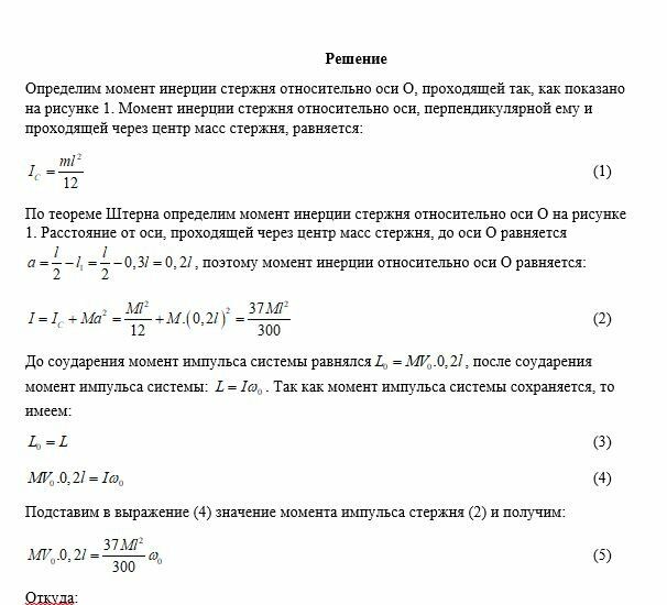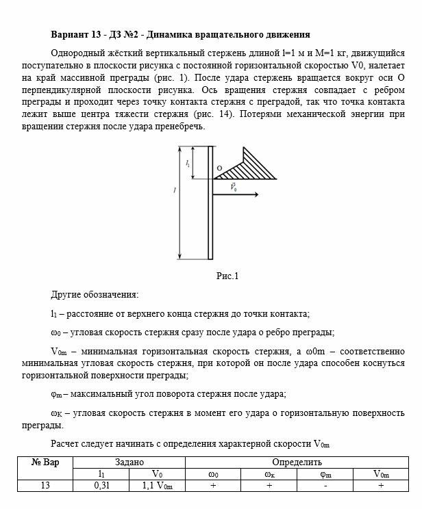 Однородный жёсткий вертикальный стержень длиной l=1 м и М=1 кг, движущийся поступательно в плоскости рисунка с постоянной горизонтальной скоростью V0, налетает на край массивной преграды (рис. 1). После удара стержень вращается вокруг оси O перпендикулярной плоскости рисунка. Ось вращения стержня совпадает с ребром преграды и проходит через точку контакта стержня с преградой, так что точка контакта лежит выше центра тяжести стержня (рис. 14). Потерями механической энергии при вращении стержня после удара пренебречь.