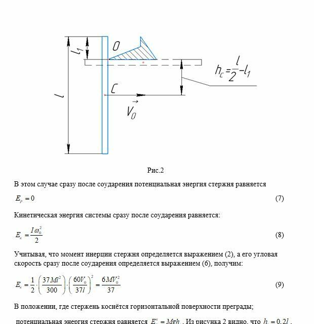 V0m – минимальная горизонтальная скорость стержня, а ω0m – соответственно минимальная угловая скорость стержня, при которой он после удара способен коснуться горизонтальной поверхности преграды;