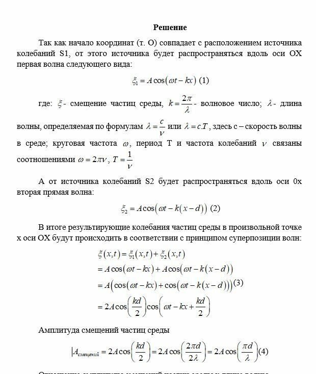 В среде на расстоянии d друг от друга находятся одинаковые излучатели плоских продольных, акустических, монохроматических волн (S1 и S2, рис.34). Оба излучателя колеблются по закону , где - смещение излучателя из положения равновесия при колебаниях, A - амплитуда, ω - круговая частота при колебаниях излучателя.