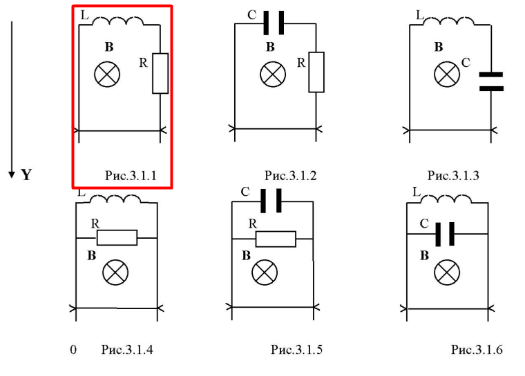 Задача 3.1. По двум гладким медным шинам, установленным вертикально в однородном магнитном поле B скользит под действием силы тяжести медная перемычка массы m, которая замыкает электрическую цепь, приведенную на рисунке. Расстояние между шинами l. Сопротивления шин, перемычки и скользящих контактов, а также самоиндукция контура пренебрежимо малы. Найти закон движения перемычки Y(t) при условии, что начальная скорость, ток через индуктивность и заряд на конденсаторе равны 0, Y(0)=Y0. L C L B B B R R C Y Рис.3.1.1 Рис.3.1.2 Рис.3.1.3 L C L R R C B B B 0 Рис.3.1.4 Рис.3.1.5 Рис.3.1.6 Таблица 3.1.1 Номера вариантов и значения параметров L , R , C для соответствующего номера рисунка.   Варианты 1-8.