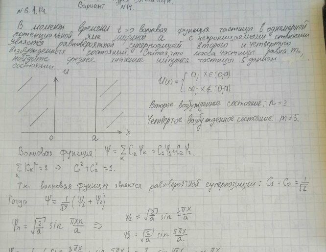 6.1.14. В момент времени t 0 волновая функция частицы в одномерной потенциальной яме шириной a с непроницаемыми стенками является равновероятной суперпозицией второго и четвертого возбужденных состояний. Считая, что масса частицы равна m0 , найдите среднее значение импульса частицы в данном состоянии.