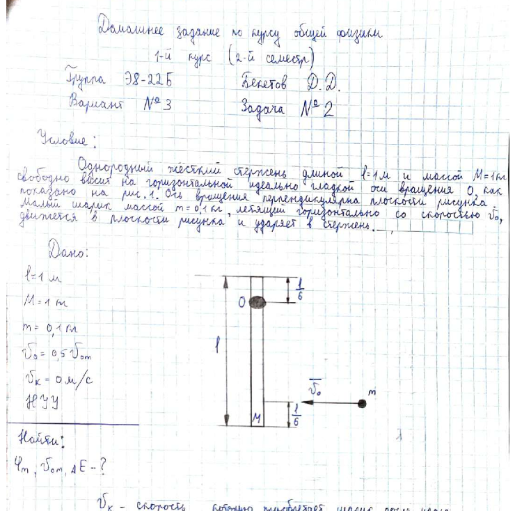 Почти всё идеально, читаемо, понятные рисунки для пояснения. Буду говорить только про вторую часть дз т.к. первую делал сам. Есть несколько маленьких незачётов которые у злых преподов могут сыграть злую шутку, так что кто читает обратите внимание. В ответе указана величина v0, хотя в задаче спрашивали величину vom, в расчёте радиуса допущена логическая ошибка, написано, что это есть расстояние от точки C до O, на самом деле расстояние от точки O до точки приложения сил. Также не указана подстановка момента инерции I в формулы. А так на отлично
