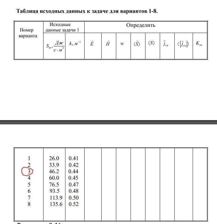 Плоская гармоническая электромагнитная волна распространяется в вакууме в положительном направлении оси Ox. Вектор плотности потока электромагнитной энергии S имеет вид: . Считая волновое число k и амплитудное значение вектора известными действительными величинами, что допустимо для однородной изотропной среды без эффектов поглощения, найти: