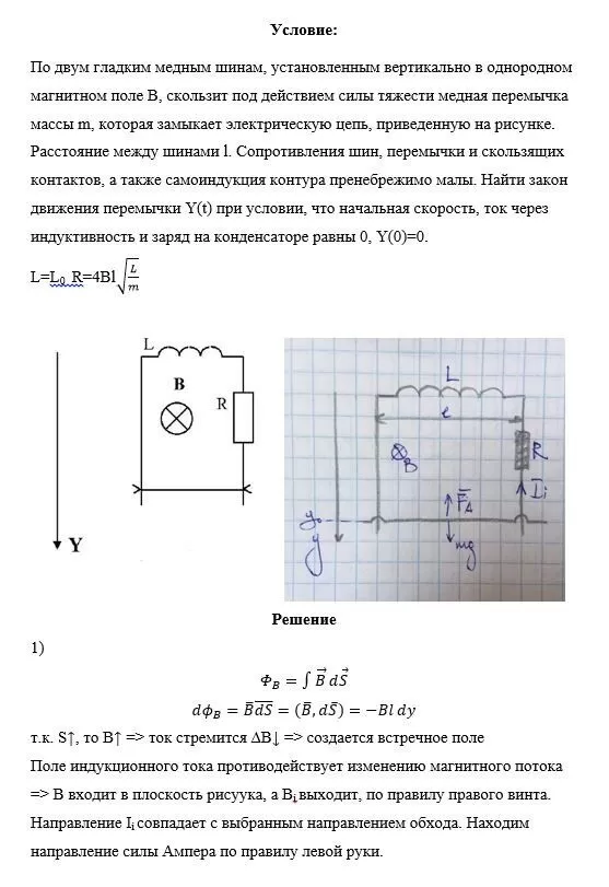 По двум гладким медным шинам, установленным вертикально в однородном магнитном поле В, скользит под действием силы тяжести медная перемычка массы m, которая замыкает электрическую цепь, приведенную на рисунке. Расстояние между шинами l. Сопротивления шин, перемычки и скользящих контактов, а также самоиндукция контура пренебрежимо малы. Найти закон движения перемычки Y(t) при условии, что начальная скорость, ток через индуктивность и заряд на конденсаторе равны 0, Y(0)=0.