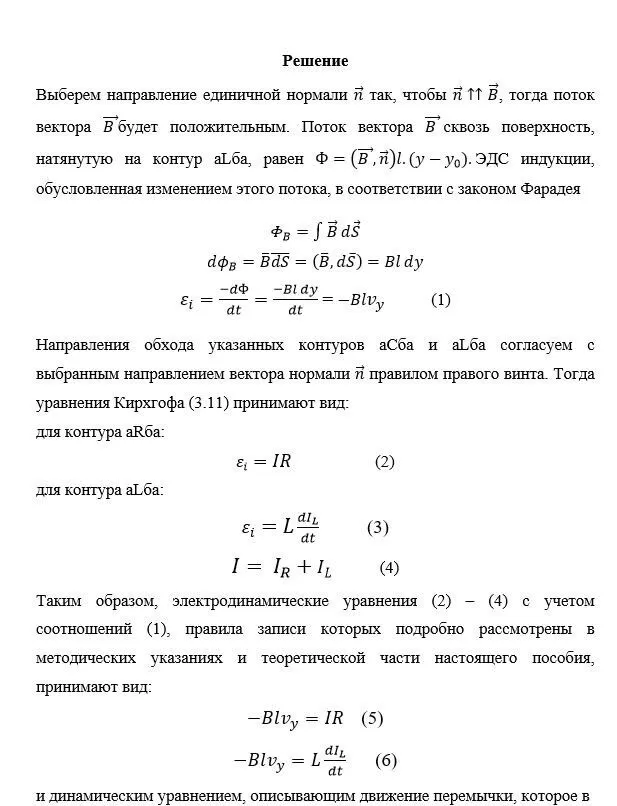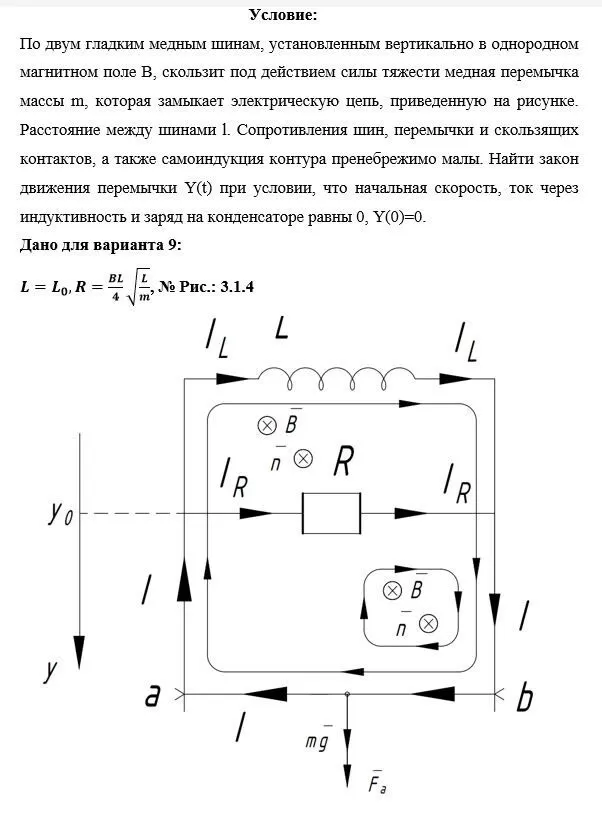 Условие:По двум гладким медным шинам, установленным вертикально в однородном магнитном поле В, скользит под действием силы тяжести медная перемычка массы m, которая замыкает электрическую цепь, приведенную на рисунке. Расстояние между шинами l. Сопротивления шин, перемычки и скользящих контактов, а также самоиндукция контура пренебрежимо малы. Найти закон движения перемычки Y(t) при условии, что начальная скорость, ток через индуктивность и заряд на конденсаторе равны 0, Y(0)=0.