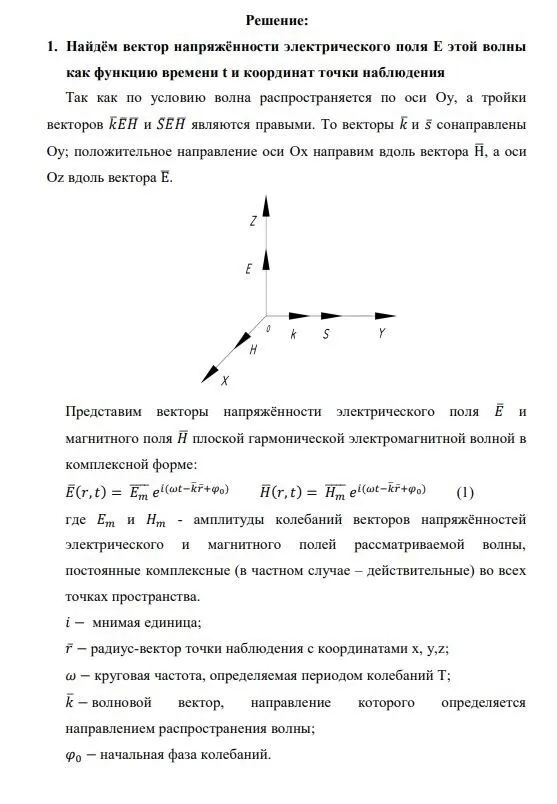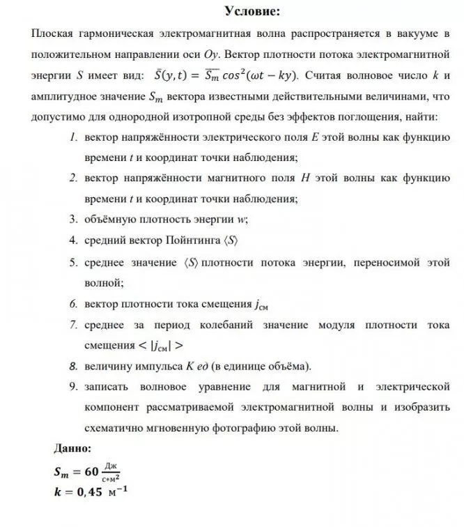 Плоская гармоническая электромагнитная волна распространяется в вакууме в положительном направлении оси Oy. Вектор плотности потока электромагнитной энергии S имеет вид: . Считая волновое число k и амплитудное значение вектора известными действительными величинами, что допустимо для однородной изотропной среды без эффектов поглощения, найти:
