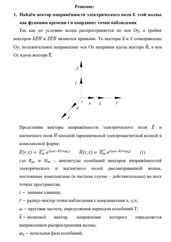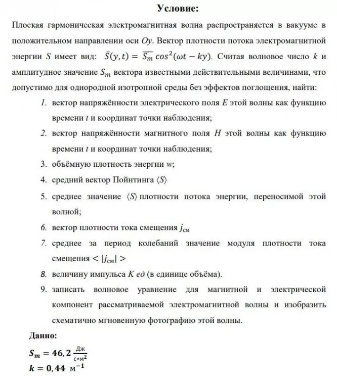 Плоская гармоническая электромагнитная волна распространяется в вакууме в положительном направлении оси Oy. Вектор плотности потока электромагнитной энергии S имеет вид: . Считая волновое число k и амплитудное значение вектора известными действительными величинами, что допустимо для однородной изотропной среды без эффектов поглощения, найти: