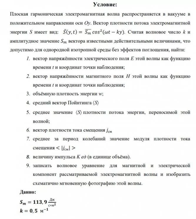 Плоская гармоническая электромагнитная волна распространяется в вакууме в положительном направлении оси Oy. Вектор плотности потока электромагнитной энергии S имеет вид: . Считая волновое число k и амплитудное значение вектора известными действительными величинами, что допустимо для однородной изотропной среды без эффектов поглощения, найти: