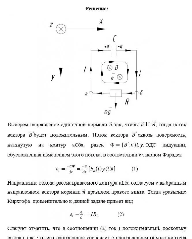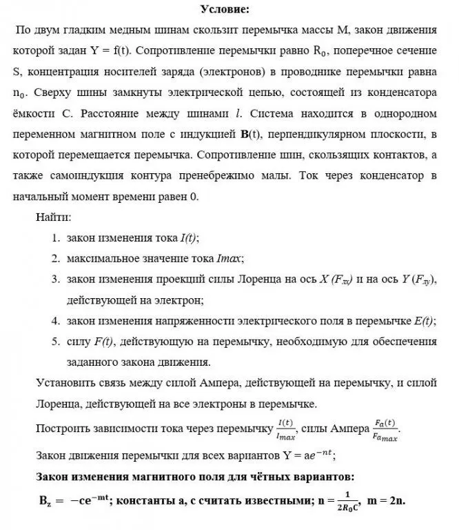 По двум гладким медным шинам скользит перемычка массы M, закон движения которой задан Y = f(t). Сопротивление перемычки равно , поперечное сечение S, концентрация носителей заряда (электронов) в проводнике перемычки равна . Сверху шины замкнуты электрической цепью, состоящей из конденсатора ёмкости С. Расстояние между шинами l. Система находится в однородном переменном магнитном поле с индукцией B(t), перпендикулярном плоскости, в которой перемещается перемычка. Сопротивление шин, скользящих контактов, а также самоиндукция контура пренебрежимо малы. Ток через конденсатор в начальный момент времени равен 0.