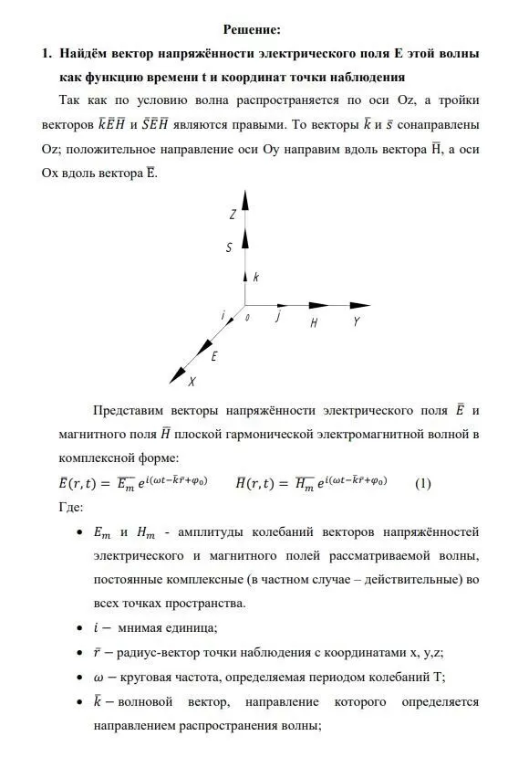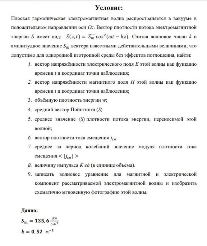 Плоская гармоническая электромагнитная волна распространяется в вакууме в положительном направлении оси Oz. Вектор плотности потока электромагнитной энергии S имеет вид: . Считая волновое число k и амплитудное значение вектора известными действительными величинами, что допустимо для однородной изотропной среды без эффектов поглощения, найти: