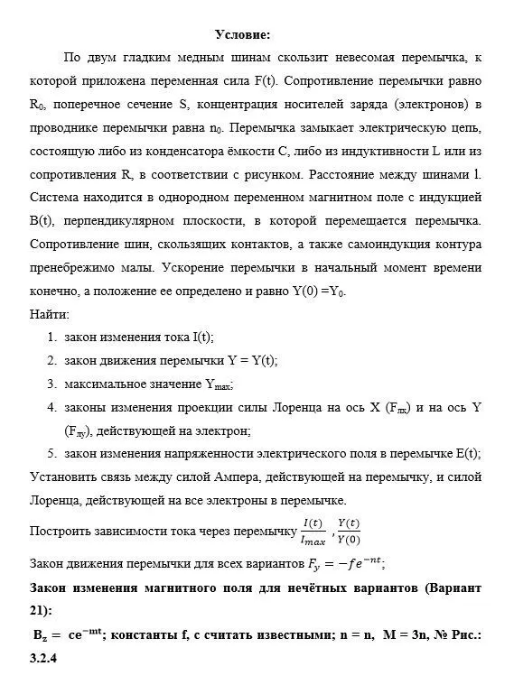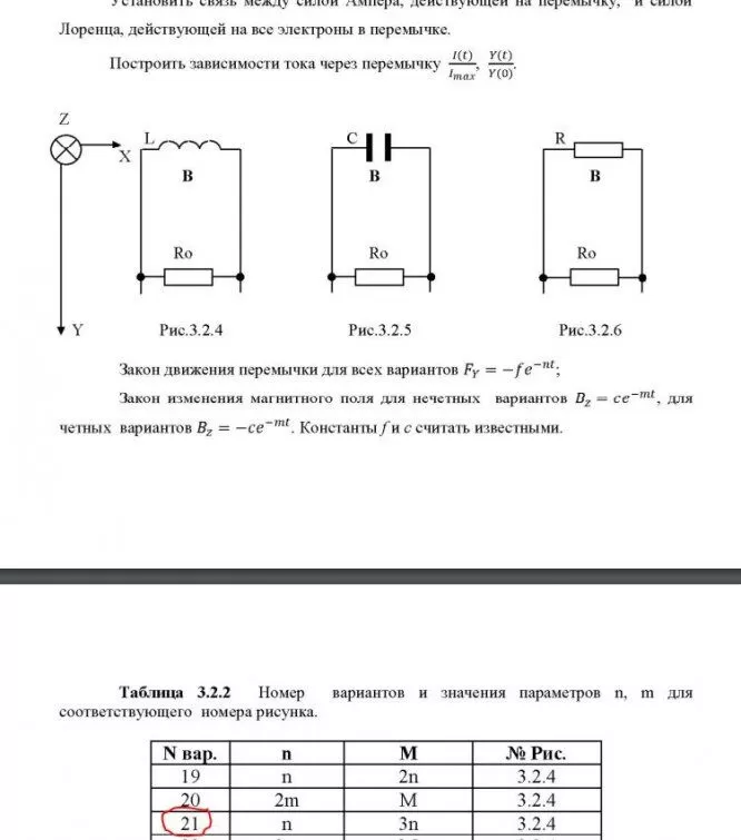 По двум гладким медным шинам скользит невесомая перемычка, к которой приложена переменная сила F(t). Сопротивление перемычки равно R0, поперечное сечение S, концентрация носителей заряда (электронов) в проводнике перемычки равна n0. Перемычка замыкает электрическую цепь, состоящую либо из конденсатора ёмкости С, либо из индуктивности L или из сопротивления R, в соответствии с рисунком. Расстояние между шинами l. Система находится в однородном переменном магнитном поле с индукцией В(t), перпендикулярном плоскости, в которой перемещается перемычка. Сопротивление шин, скользящих контактов, а также самоиндукция контура пренебрежимо малы. Ускорение перемычки в начальный момент времени конечно, а положение ее определено и равно Y(0) =Y0.