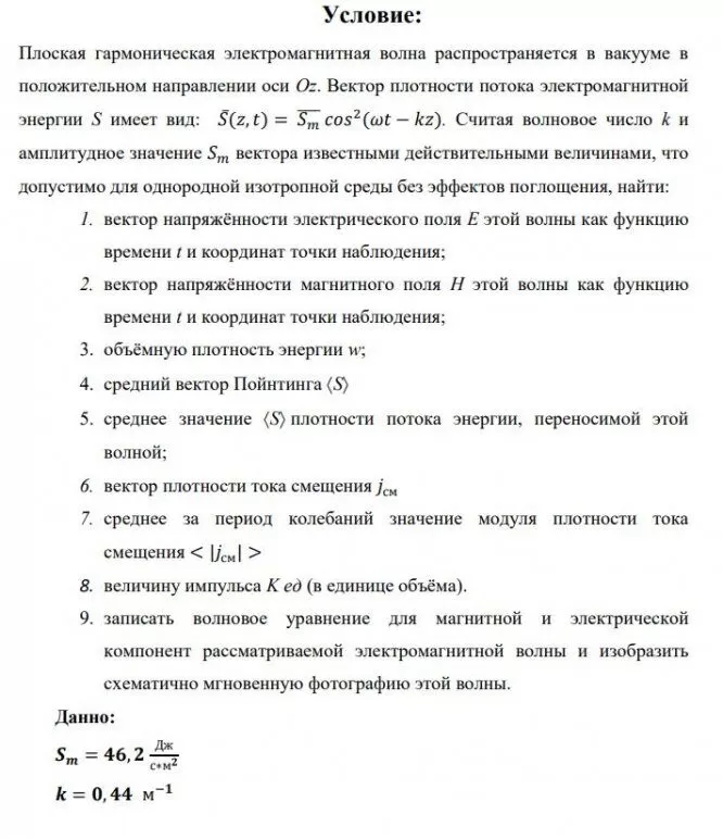 Плоская гармоническая электромагнитная волна распространяется в вакууме в положительном направлении оси Oz. Вектор плотности потока электромагнитной энергии S имеет вид: . Считая волновое число k и амплитудное значение вектора известными действительными величинами, что допустимо для однородной изотропной среды без эффектов поглощения, найти: