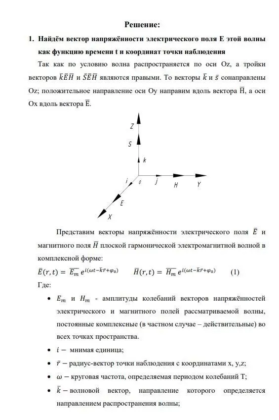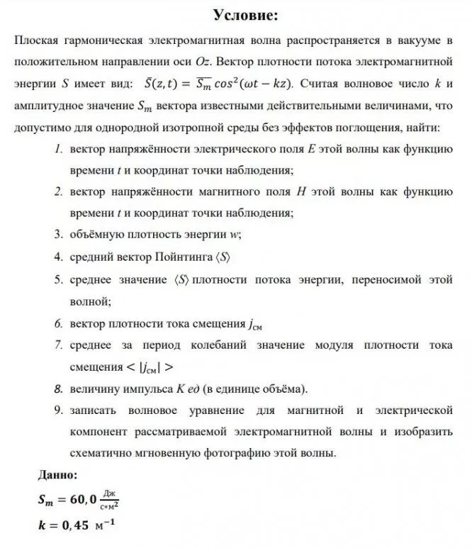 Условие:Плоская гармоническая электромагнитная волна распространяется в вакууме в положительном направлении оси Oz. Вектор плотности потока электромагнитной энергии S имеет вид: . Считая волновое число k и амплитудное значение вектора известными действительными величинами, что допустимо для однородной изотропной среды без эффектов поглощения, найти: