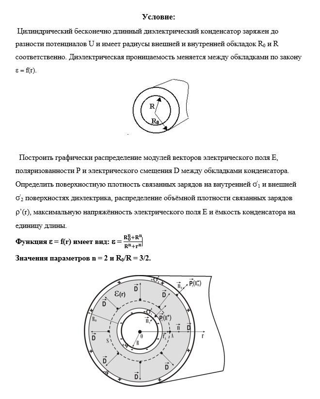 Построить графически распределение модулей векторов электрического поля Е, поляризованности Р и электрического смещения D между обкладками конденсатора. Определить поверхностную плотность связанных зарядов на внутренней s'1 и внешней s'2 поверхностях диэлектрика, распределение объёмной плотности связанных зарядов r’(r), максимальную напряжённость электрического поля Е и ёмкость конденсатора на единицу длины.