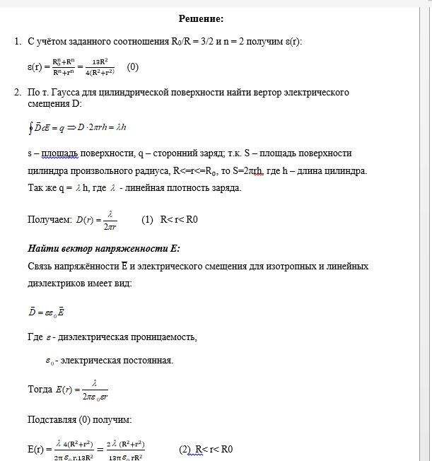 Цилиндрический бесконечно длинный диэлектрический конденсатор заряжен до разности потенциалов U и имеет радиусы внешней и внутренней обкладок R0 и R соответственно. Диэлектрическая проницаемость меняется между обкладками по закону e = f(r).