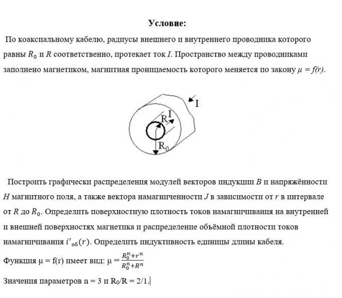 По коаксиальному кабелю, радиусы внешнего и внутреннего проводника которого равны и R соответственно, протекает ток I. Пространство между проводниками заполнено магнетиком, магнитная проницаемость которого меняется по закону μ = f(r).