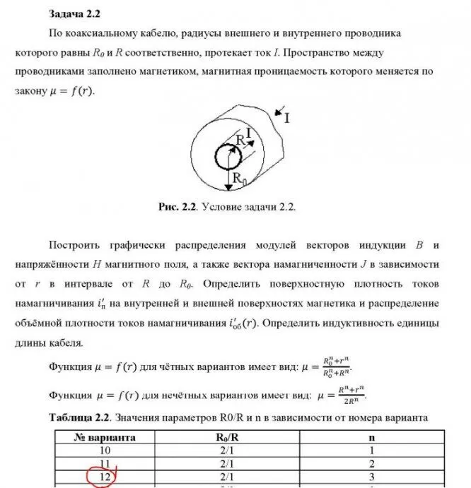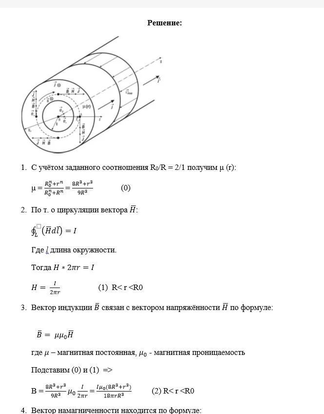 Построить графически распределения модулей векторов индукции B и напряжённости H магнитного поля, а также вектора намагниченности J в зависимости от r в интервале от R до . Определить поверхностную плотность токов намагничивания на внутренней и внешней поверхностях магнетика и распределение объёмной плотности токов намагничивания . Определить индуктивность единицы длины кабеля.