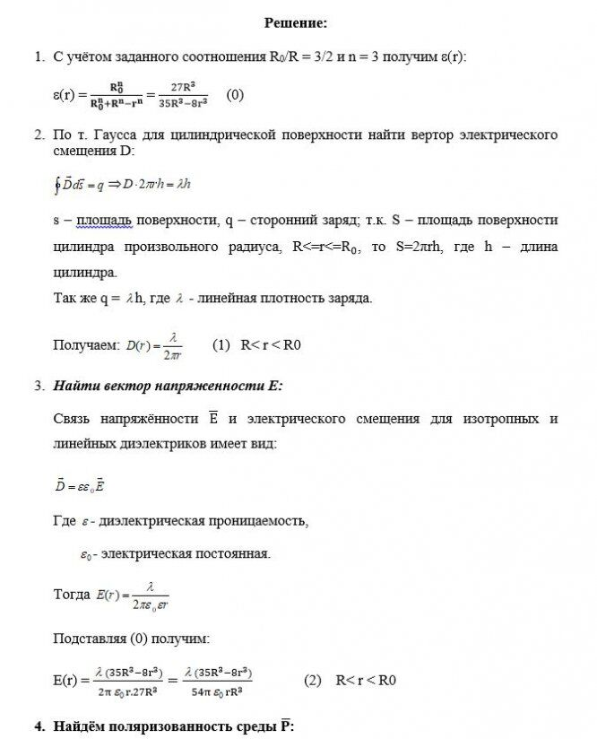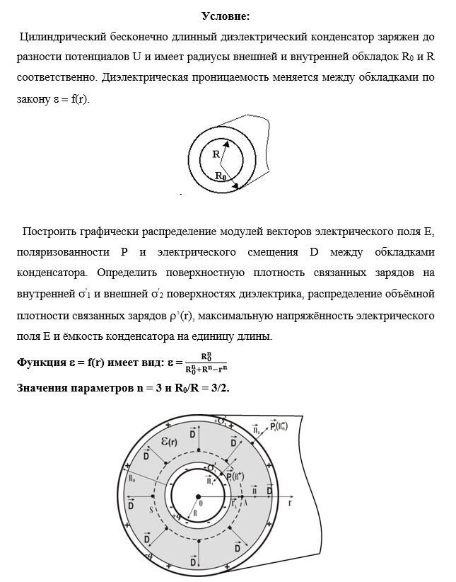 Условие:Цилиндрический бесконечно длинный диэлектрический конденсатор заряжен до разности потенциалов U и имеет радиусы внешней и внутренней обкладок R0 и R соответственно. Диэлектрическая проницаемость меняется между обкладками по закону e = f(r).