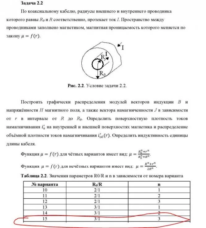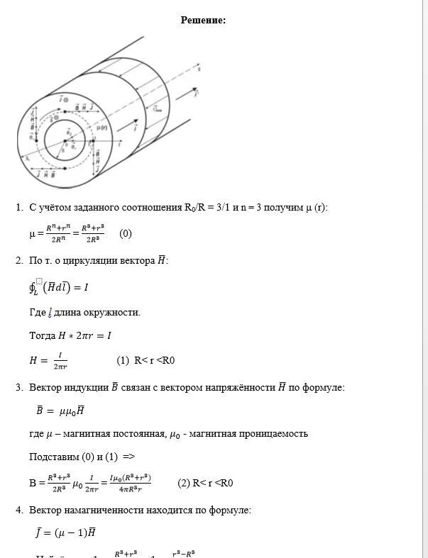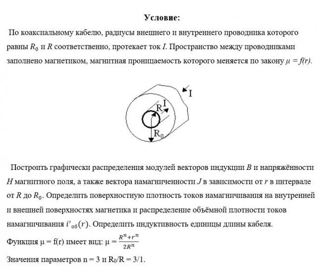 Условие:По коаксиальному кабелю, радиусы внешнего и внутреннего проводника которого равны и R соответственно, протекает ток I. Пространство между проводниками заполнено магнетиком, магнитная проницаемость которого меняется по закону μ = f(r).